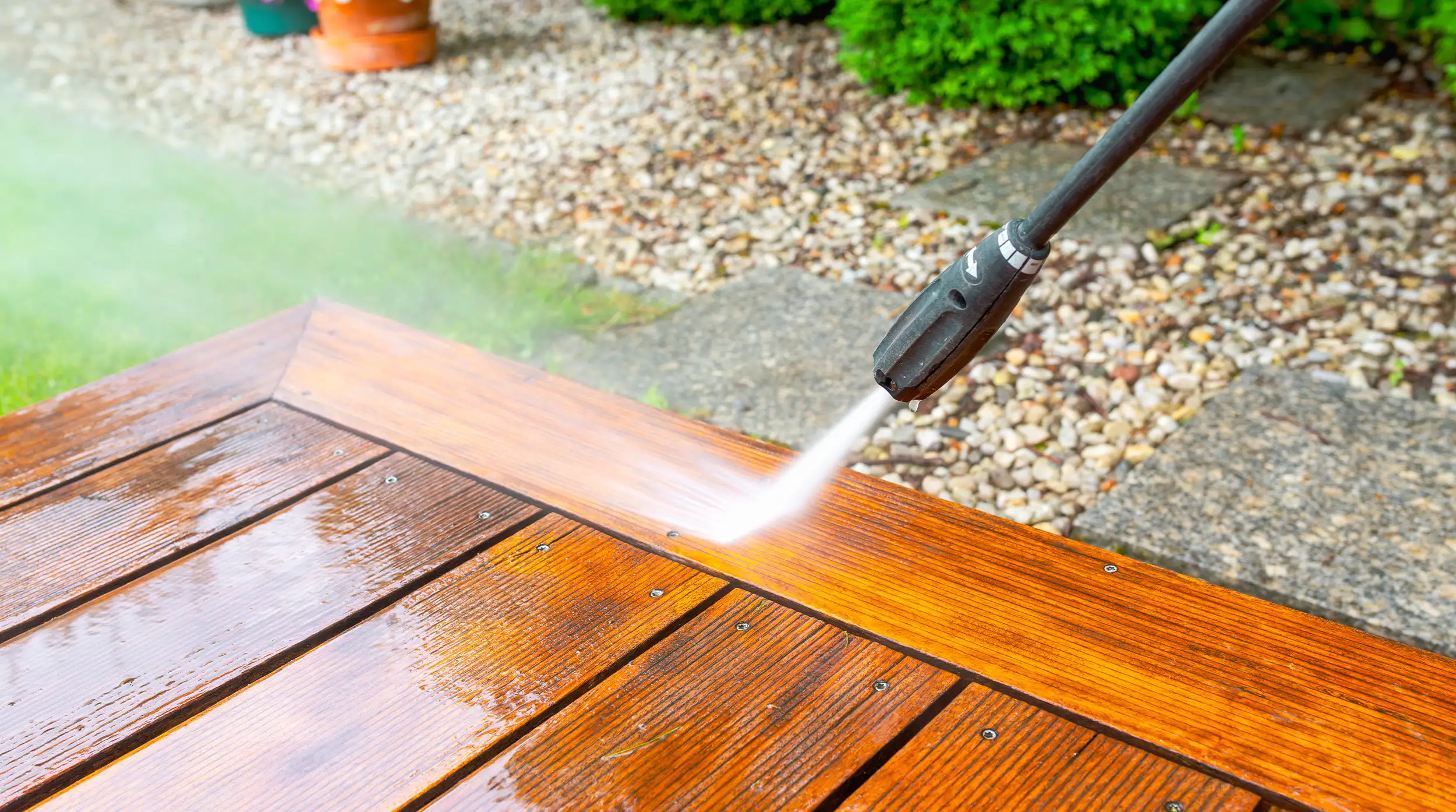 Für die Reinigung reicht in der Regel klares Wasser, beispielsweise aus dem Gartenschlauch, aus. Alternativ kann ein Hochdruckreiniger mit sanft eingestelltem Strahl verwendet werden. Bei stärkeren Verschmutzungen empfiehlt sich der Einsatz von warmer Seifenlauge in Kombination mit einer weichen Bürste. Dabei ist darauf zu achten, dass der Wasserstrahl nicht zu stark eingestellt wird, da dies die Holzoberfläche beschädigen kann.
