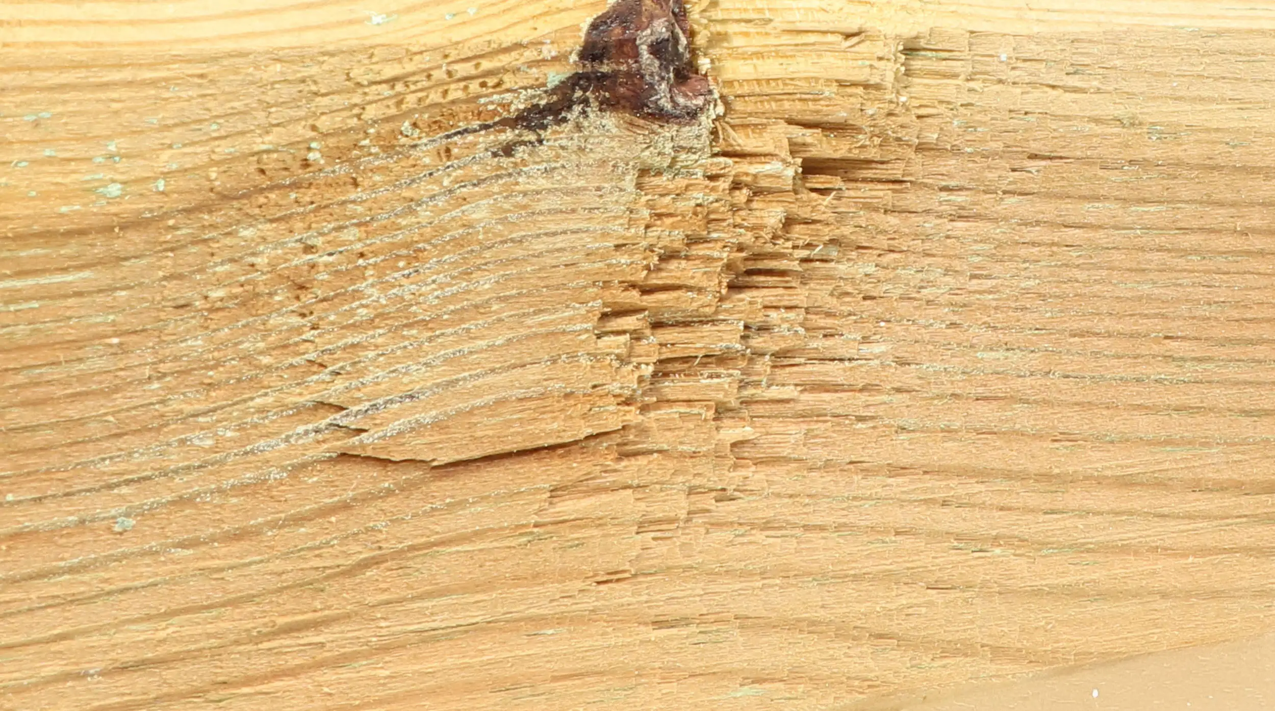 Auch bei sorgfältiger Verarbeitung können vereinzelt raue Oberflächen, leichte Hobelspuren oder kleine Faserausrisse auftreten, insbesondere in Astbereichen sowie an Quer- und Kopfschnitten. Diese materialtypischen Erscheinungen haben keinen Einfluss auf die Funktion oder die Qualität des Holzes.