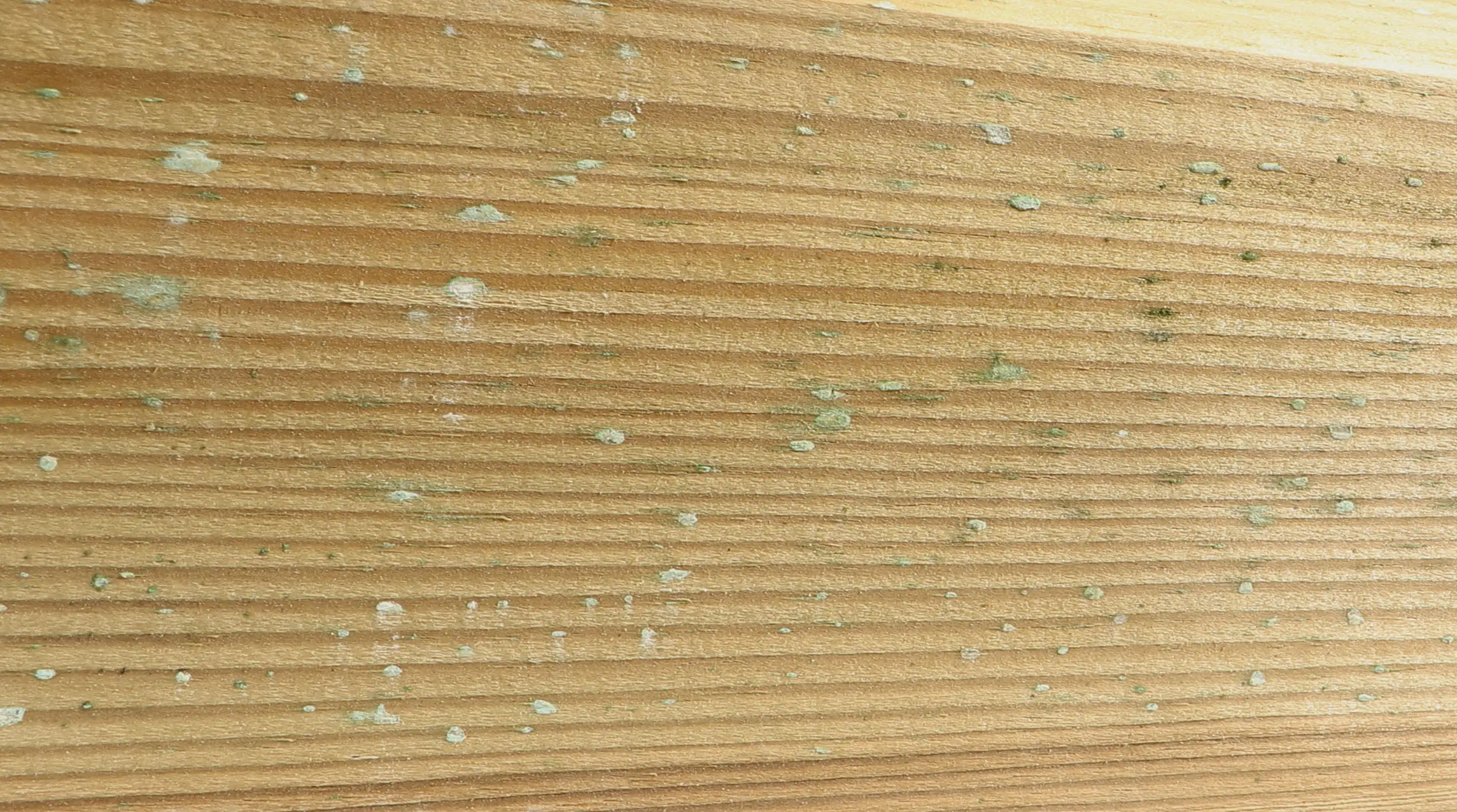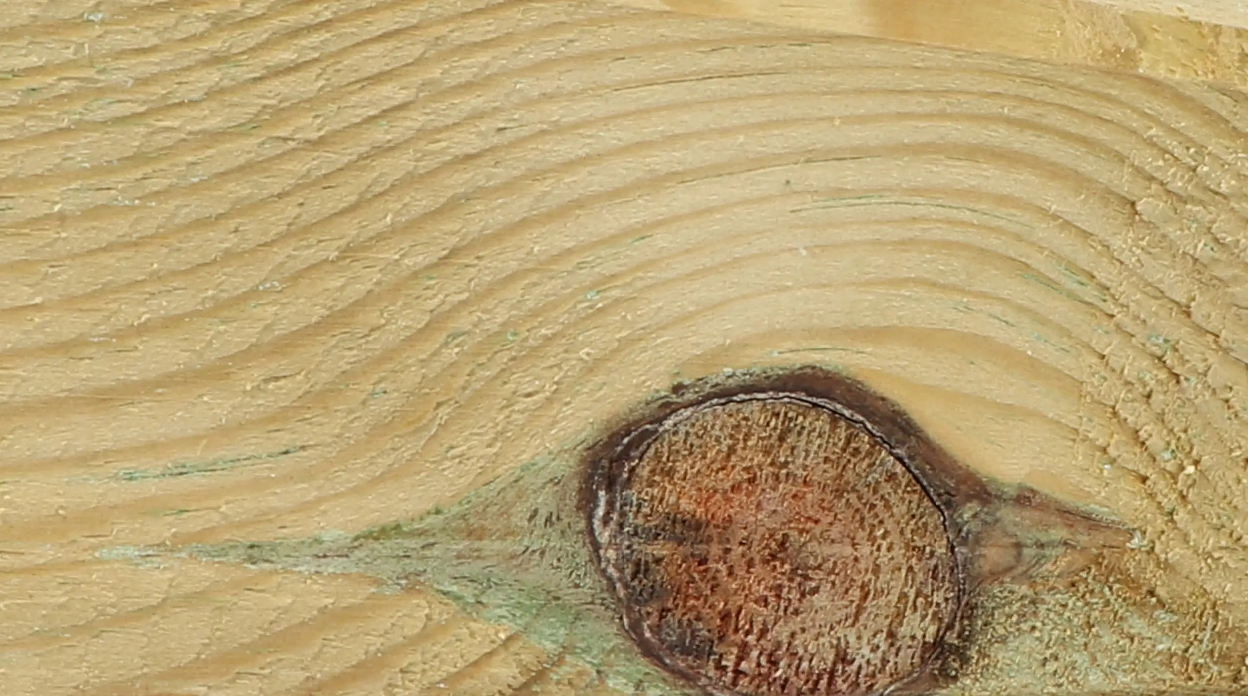 Grünliche Verfärbungen entstehen häufig durch Salzausblühungen der Kesseldruckimprägnierung, die sich an der Holzoberfläche mit Harzbestandteilen verbinden. Diese Erscheinung ist unbedenklich, bildet sich im Laufe der Zeit durch Witterungseinflüsse zurück und gilt als Hinweis auf eine wirksame Schutzbehandlung des Holzes.